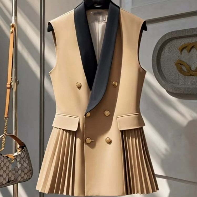 Introducing the Elegant Two-Tone Blazer Vest – a chic and modern piece to elevate your wardrobe! This sophisticated vest combines sleek, neutral shades of beige and white with a structured silhouette that is both fashionable and flattering. Featuring a stylish belt and double-breasted button details, it exudes an effortlessly polished look. Pair it with trousers for a professional ensemble or a skirt for a more feminine touch. Perfect for any occasion, this jacket adds a refined statement to your everyday or evening wear.