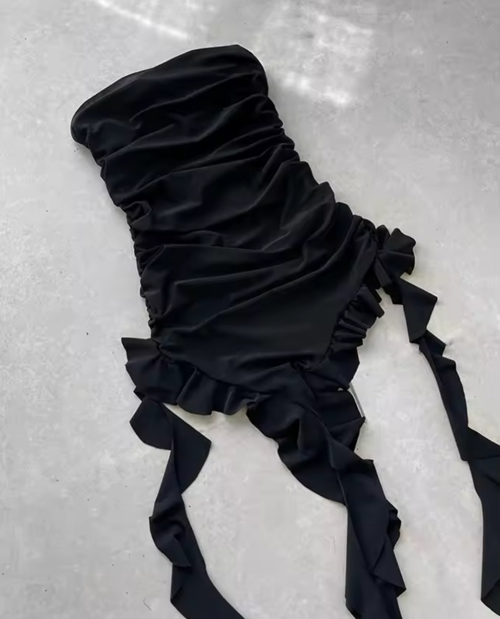 Women Strapless Sexy Floral Fold Hemline High Slit Mini Dress 2024 Solid Backless Sleeveless Black And Pink Party Dress Vestidos